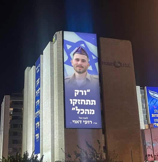 "שלום, שמי עדן, אחותו של סמ"ר רועי דאווי הי"ד שנפל בעזה. עבורי יום הזיכרון הוא לא רק יום הדיכאון, אלא יום שבו אנחנו גם מתחברים לנופלים ושואבים כוח ומשמעות מהרוח שלהם. חשוב לי לשתף ברוח שלנו, של רועי אחי. לכן תלינו בכניסה לירושלים שלט פרסום ענק עם המילים האחרונות שלו: 'ורק תתחזקו מהכל'.