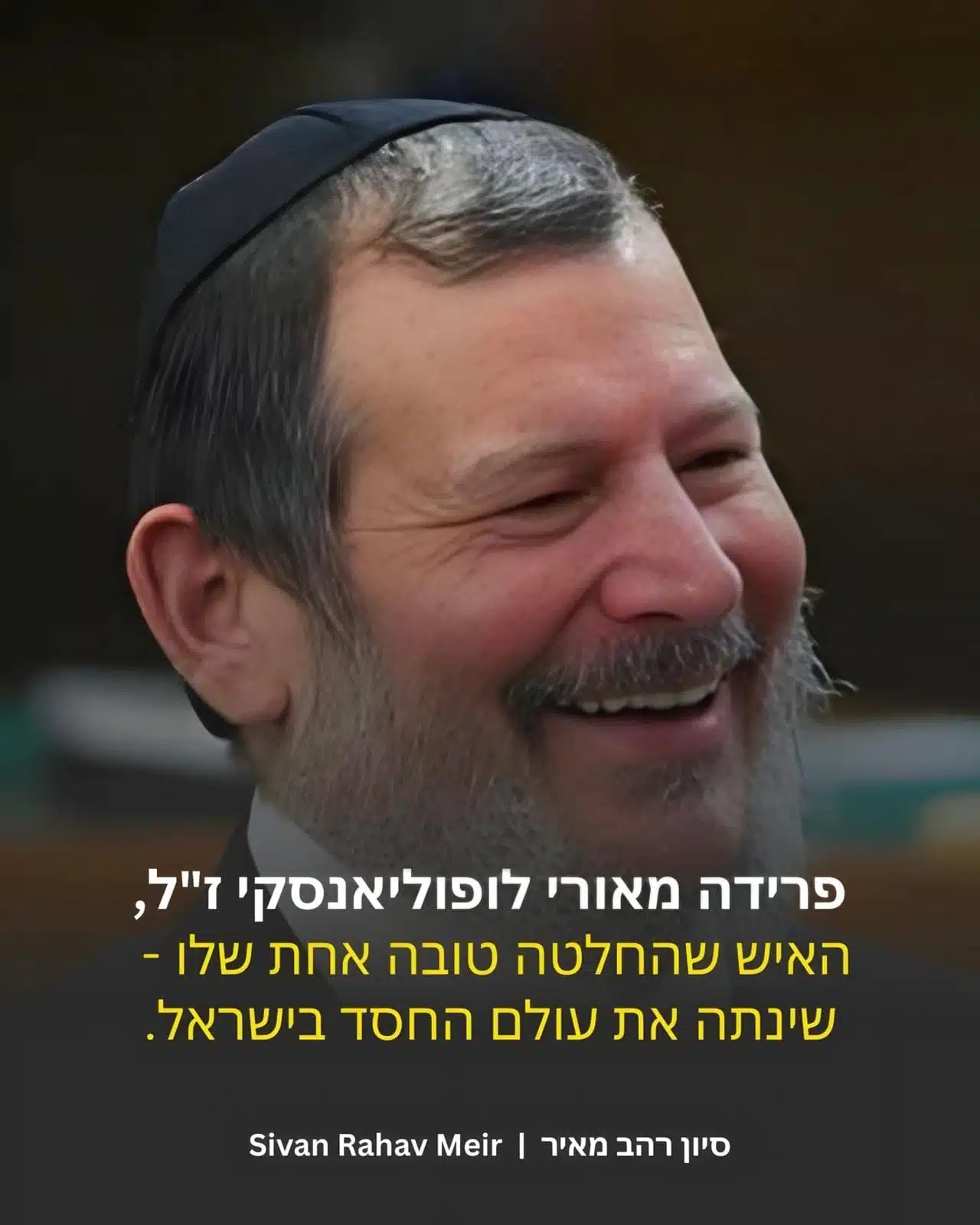 אתמול הלך לעולמו איש החסד לופוליאנסקי בגיל 74, אחרי שהארגון שהקים קיבל את פרס ישראל, זכה לעזור למיליונים, והפך למודל בינלאומי שהועתק לכל העולם. ואת כל הניהול של העשייה האדירה הוא לא עשה בלחץ או בגאווה. הכול נעשה עם החיוך הנעים והמפורסם שלו. פגשתי אותו לאחרונה והוא היה כתמיד – בשיא העשייה, בשיא החביבות.