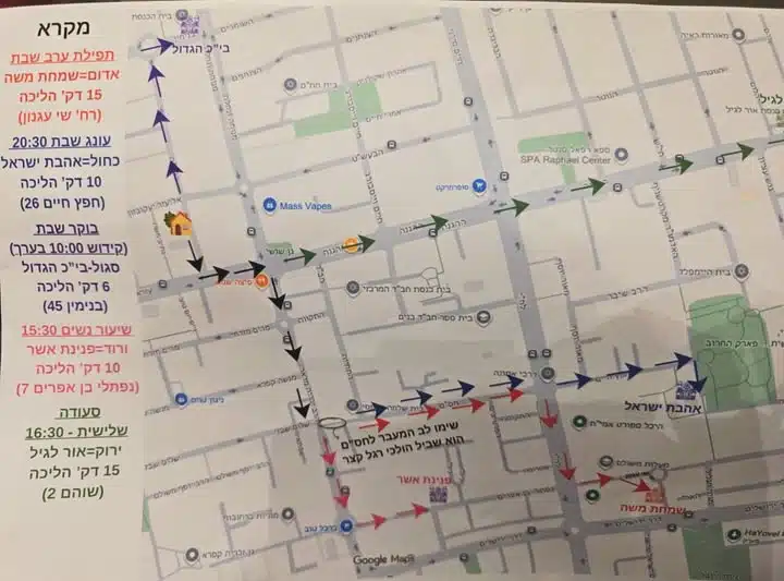 זו המפה שחיכתה לנו בערב שבת. מפה של העיר רחובות, עם חיצים והסברים, כדי להגיע לכמה שיותר בתי כנסת ולפגוש כמה שיותר אנשים.