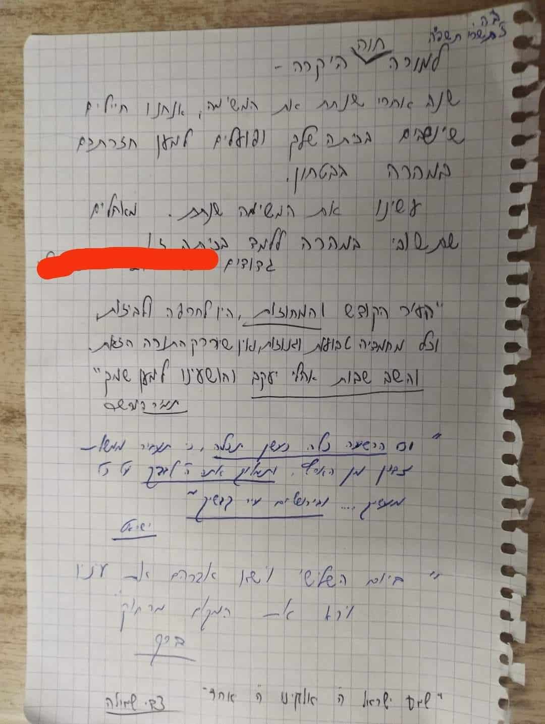 הצצתי בדפי המחברת המקסימים שנשלחו למורה: "תחוקקנו לחיים ותיטיב לנו החתימה", "אל תירא יעקב", "ישראל נושע בה' תשועת עולמים, גם היום יוושעו מפיך שוכן מרומים", "הושיענו למען שמך", "שמע ישראל ה' אלוקינו ה' אחד" ועוד ועוד ציטוטים עוצמתיים, מחזקים, בכתב יד של אנשים מבוגרים.