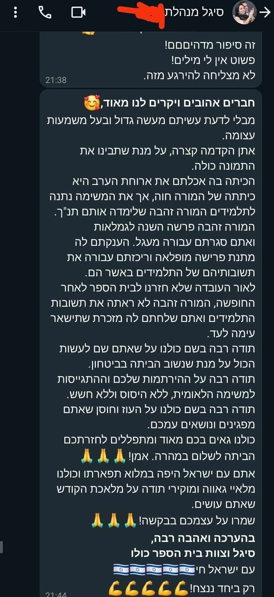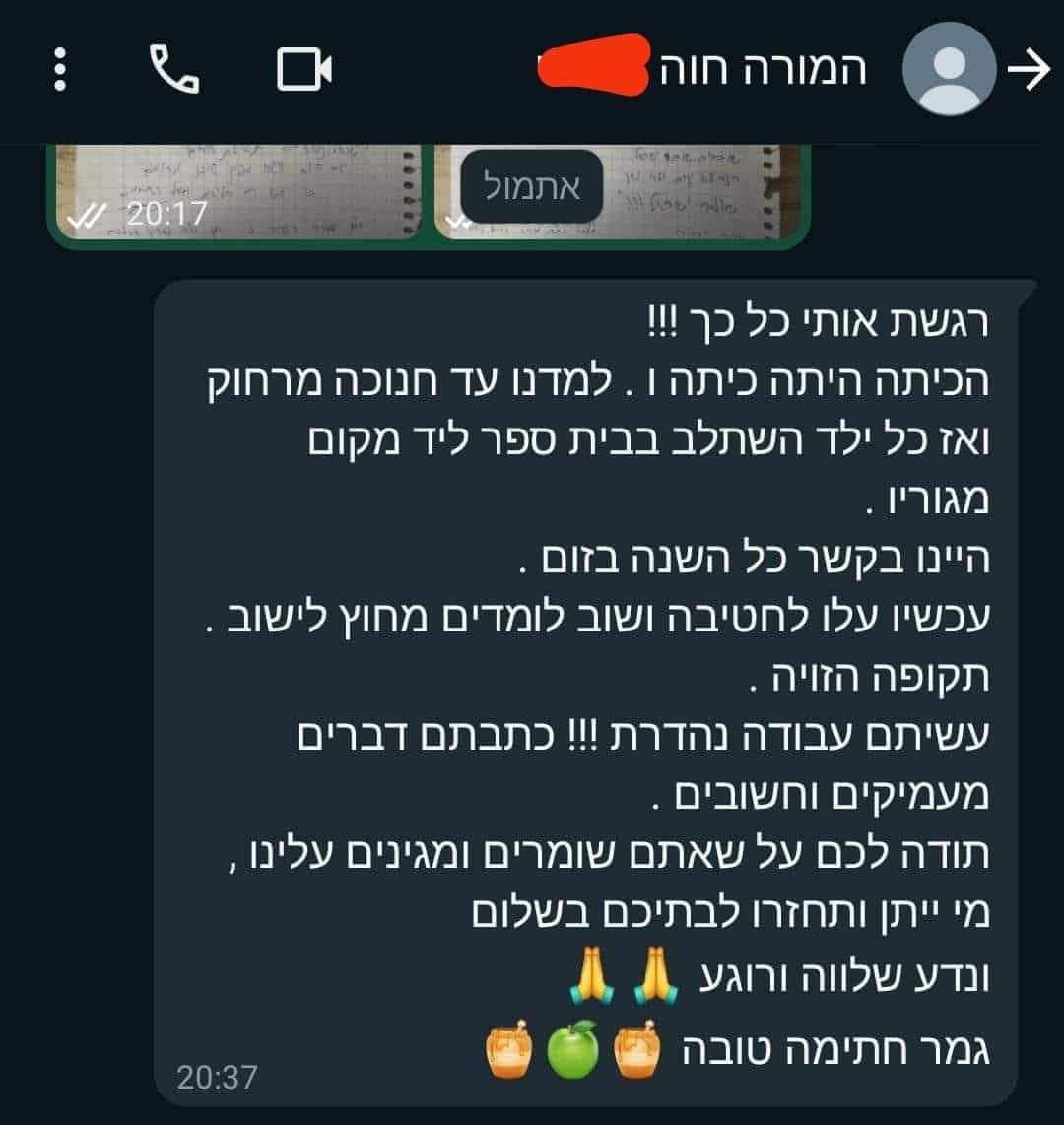 לא פלא שמנהלת בית הספר, סיגל, התרגשה כל כך מהסיפור הזה: "בלי לדעת", היא כתבה להם, "עשיתם מעשה גדול בעל משמעות עצומה. המורה זהבה פרשה השנה לגמלאות, ואתם סגרתם עבורה כעת מעגל. הענקתם לה מתנת פרישה, כיוון שלא חזרנו לבית הספר. תודה שאתם פועלים שם, כדי שנחזור הביתה בביטחון". מאז מתקבלות אינספור תגובות נרגשות של מורים, הורים וילדים מבית הספר הזה, שקיבלו חתיכת דרישת שלום לפני יום כיפור.