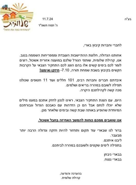 המכתב של חברי הישוב שלומית לחברי בארי