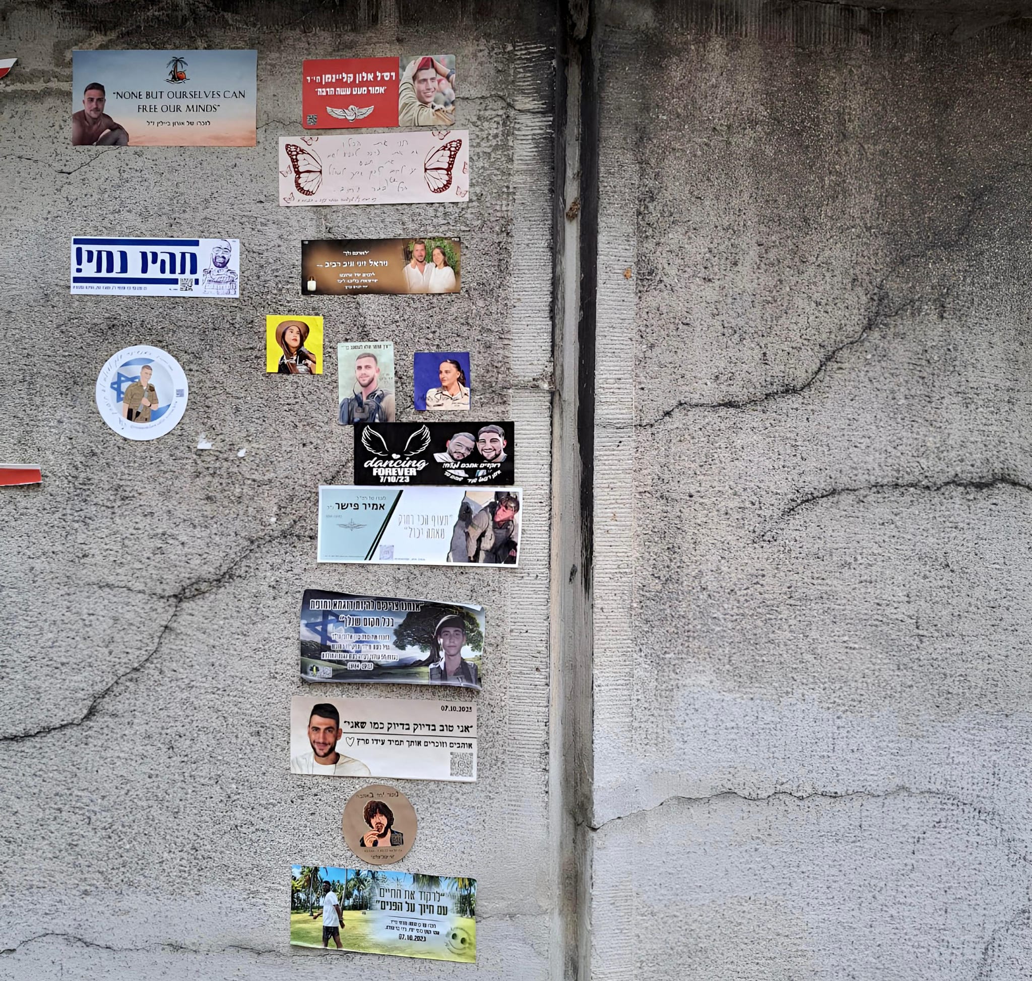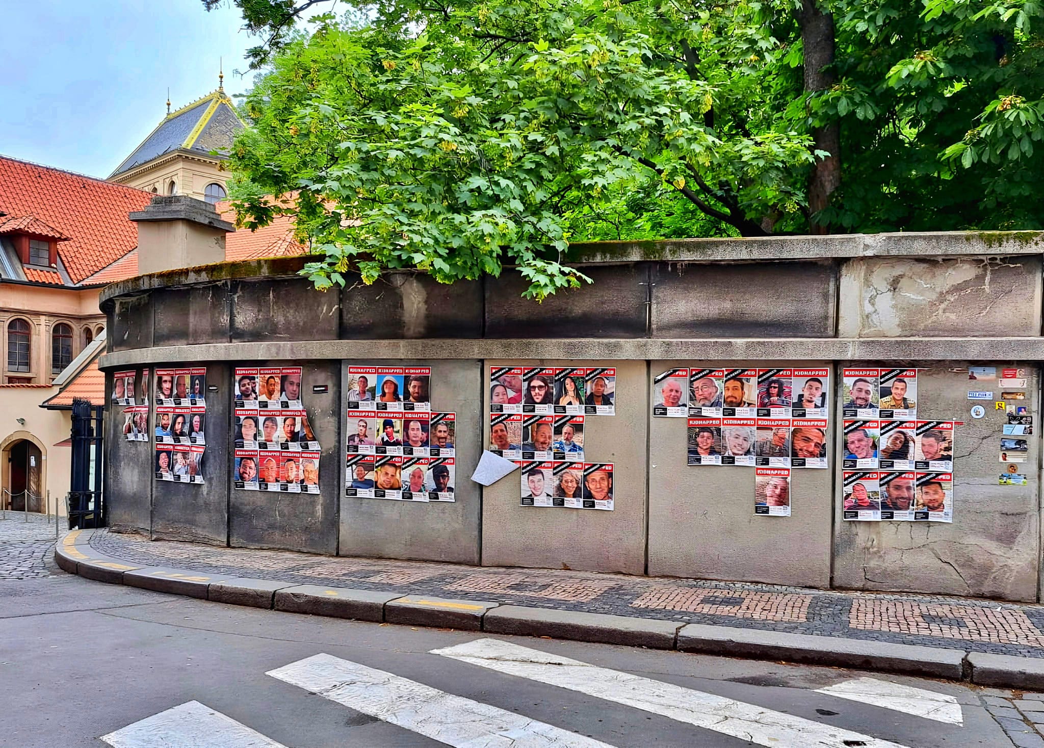 "שלום סיון, כתבת על הסטיקרים הקדושים שמכסים את ישראל. ובכן, הנה הקיר החיצוני של בית הקברות העתיק של פראג. בפנים - קבר המהר"ל מפארג. ובחוץ יש מדבקות בעברית עם משפטים של הנופלים וגם תמונות של החטופים. אף אחד לא תולש אותן, להיפך, צ'כיה תומכת במדינת ישראל והיה מרגש לראות את המחוות האלה כאן בפומבי. בשורות טובות".