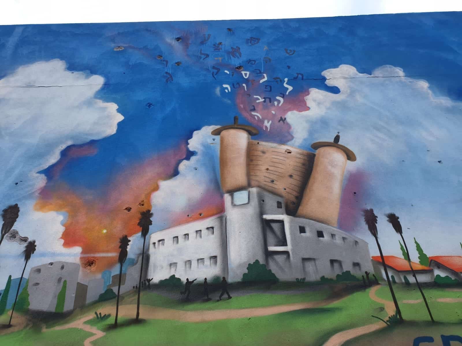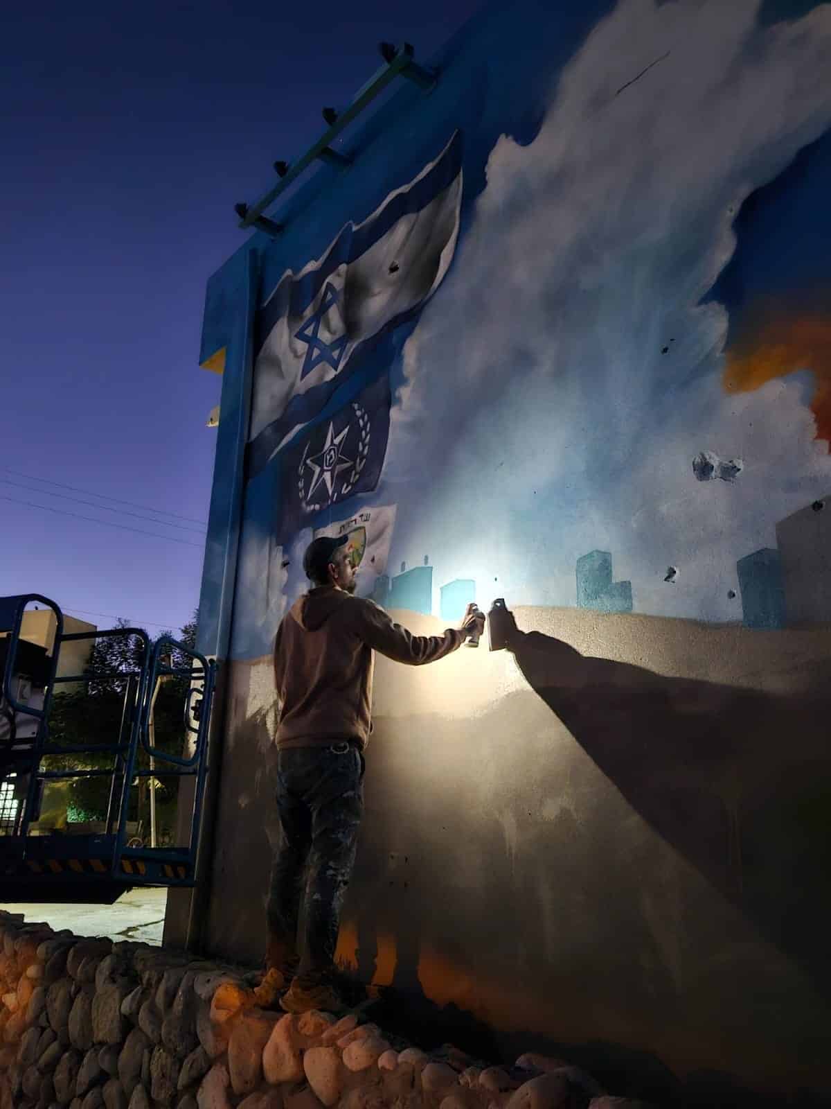 אבל העיקר הוא ספר התורה הפתוח, שמסמל את חג שמחת תורה. 8 שוטרים נפלו בתחנה ועוד 2 לוחמים שבאו לזירה. 10 נשמות. מניין. רציתי לעשות 10 חורים בספר התורה, ואז ראיתי שיש בקיר חורי ירי אמיתיים מהקרבות. השתמשתי בהם. היה לי קשה לצייר ספר תורה ירוי, עם חורים, אבל זה מה שקרה וניסיתי לבטא זאת. הכול קרה ביום שבו התורה שמחה ואנחנו שמחים איתה, והם ניסו לפגוע בזה.