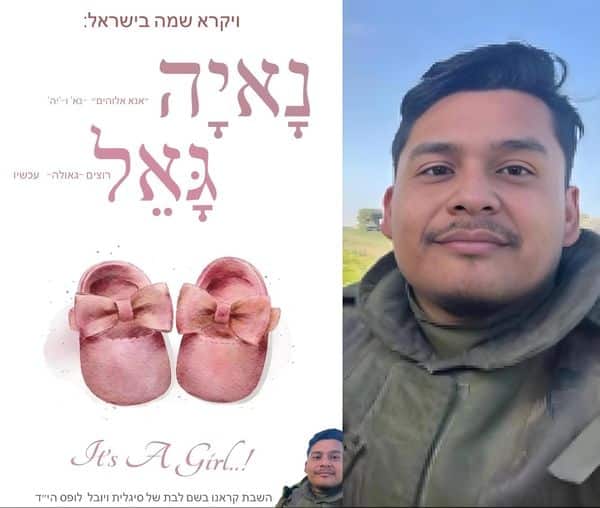 "שלום סיון, בן משפחתנו, רס״ל במילואים יובל לופס הי״ד נפל בעזה בינואר האחרון. הרגשנו שעם ישראל היה איתנו באבל, ורצינו לשתף אותו כעת גם בשמחה: אשתו סיגלית ילדה השבוע את הבת הרביעית שלהם, ובשבת בבוקר ניתן לה השם בבית הכנסת. הרגשנו את הנשמה של יובל איתנו, וברגשות מעורבים, נקרא שמה בישראל: נאיה גאל. וסיגלית הסבירה: