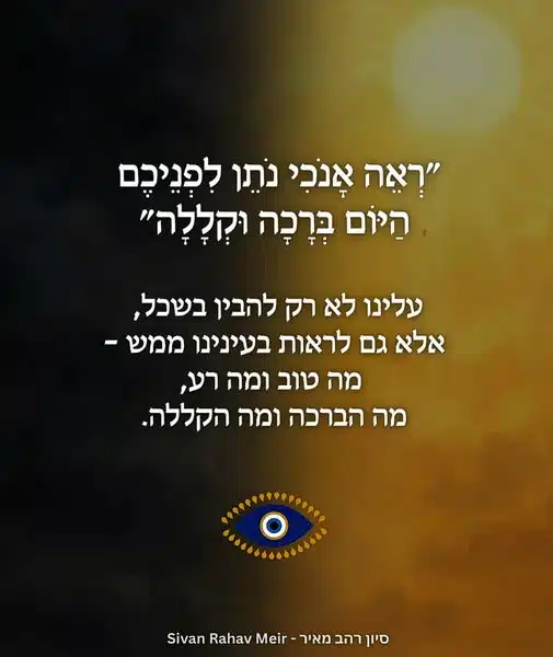 "רְאֵה אָנֹכִי נֹתֵן לִפְנֵיכֶם הַיּוֹם בְּרָכָה וּקְלָלָה". אנחנו הרי מבינים מה ההבדל בין הברכה לקללה, בין טוב לרע. אבל התורה מבקשת שנתאמץ לא רק לדעת בשכל, אלא גם לראות בעינינו מה טוב ומה רע. יהי רצון שנזכה אכן לראות את הברכה בבירור, וגם לבחור בה.