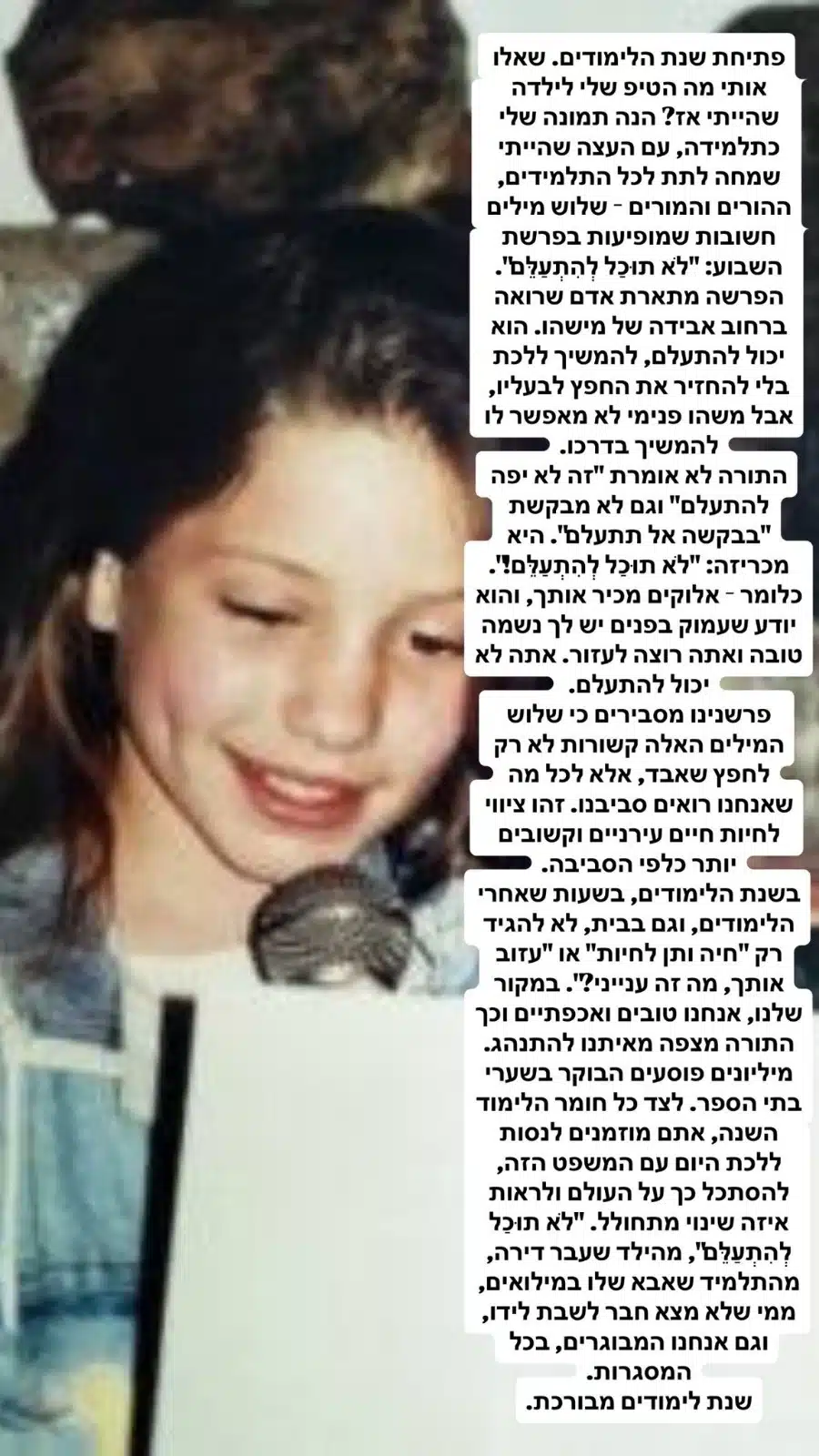 פתיחת שנת הלימודים. שאלו אותי מה הטיפ שלי לילדה שהייתי אז? הנה תמונה שלי כתלמידה, עם העצה שהייתי שמחה לתת לכל התלמידים, ההורים והמורים - שלוש מילים חשובות שמופיעות בפרשת השבוע: "לֹא תוּכַל לְהִתְעַלֵּם".