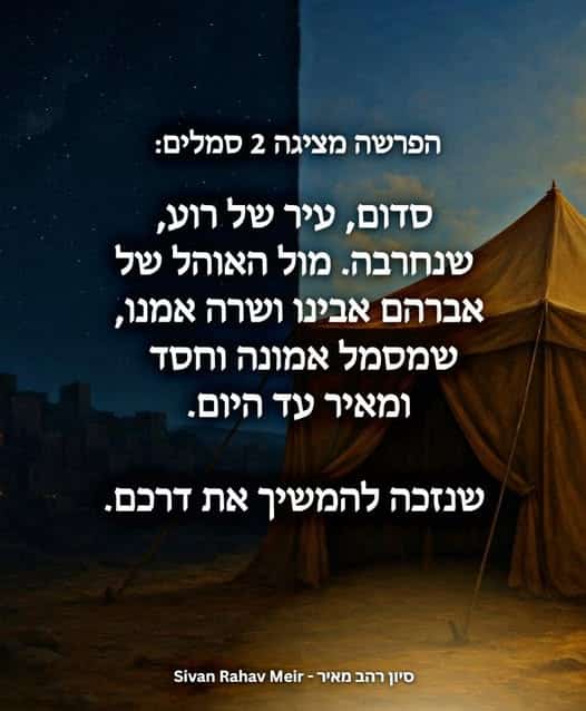 - הפרשה מתארת גם כיצד נחרבה העיר סדום, עיר שהיו בה הרבה רוע, אלימות ושחיתות. העיר סדום היא ממש סמל של חושך, מול האוהל של אברהם, שהיה בית של נתינה ואור. שנזכה להמשיך את דרכו המאירה של אברהם.
