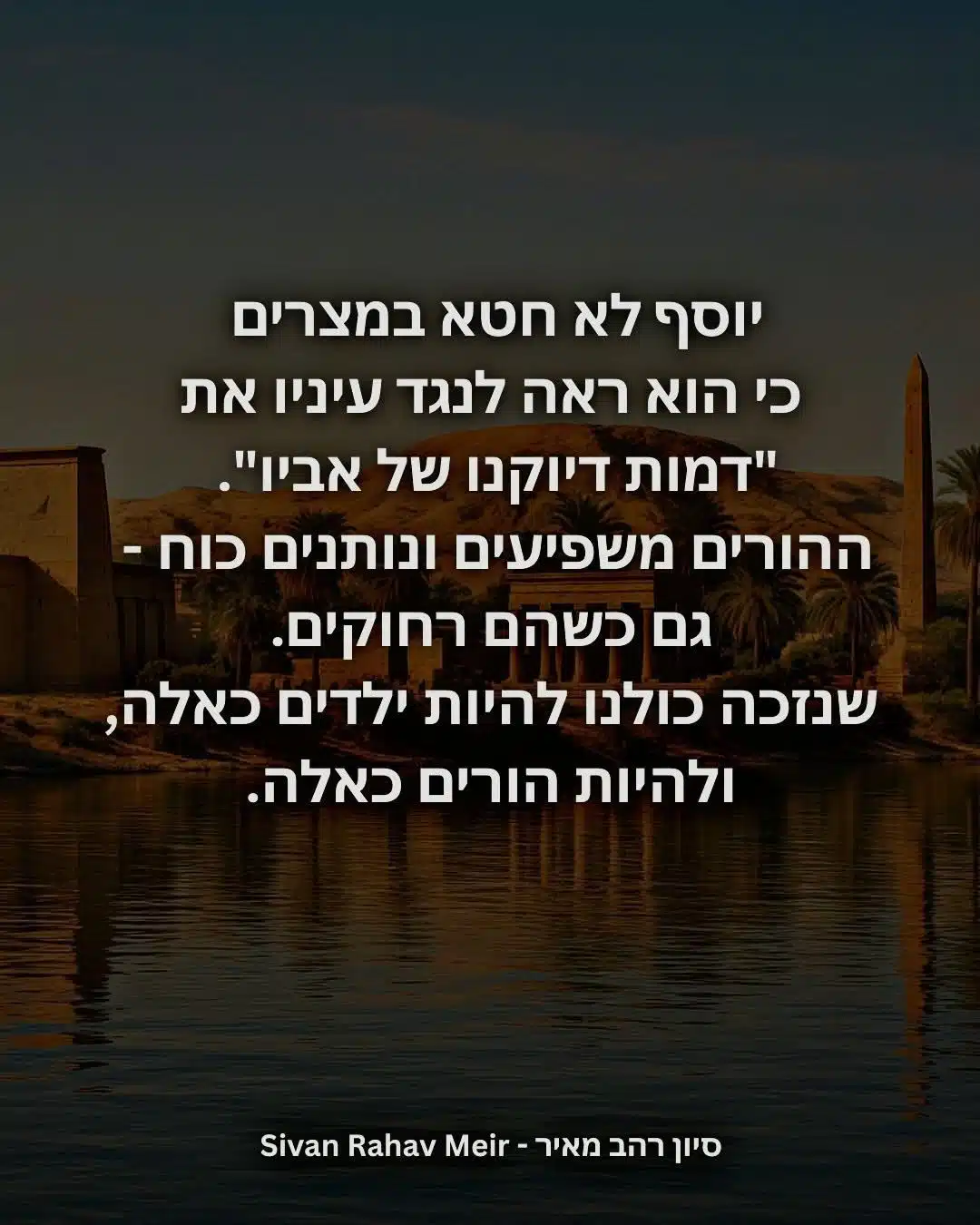 4. Our commentators explain that one of the reasons Yosef did not sin in Egypt was that he saw before his eyes "the image of his father's face." Parents influence us even when they are not next to us telling us what to do. They inspire love and loyalty even when they are far away. Even in the pit, even in the house of Potiphar the Egyptian, and even in prison, Yosef remembers Yaakov and his Judaism and wants to remain part of it. May we all merit to be such children, and to be such parents.