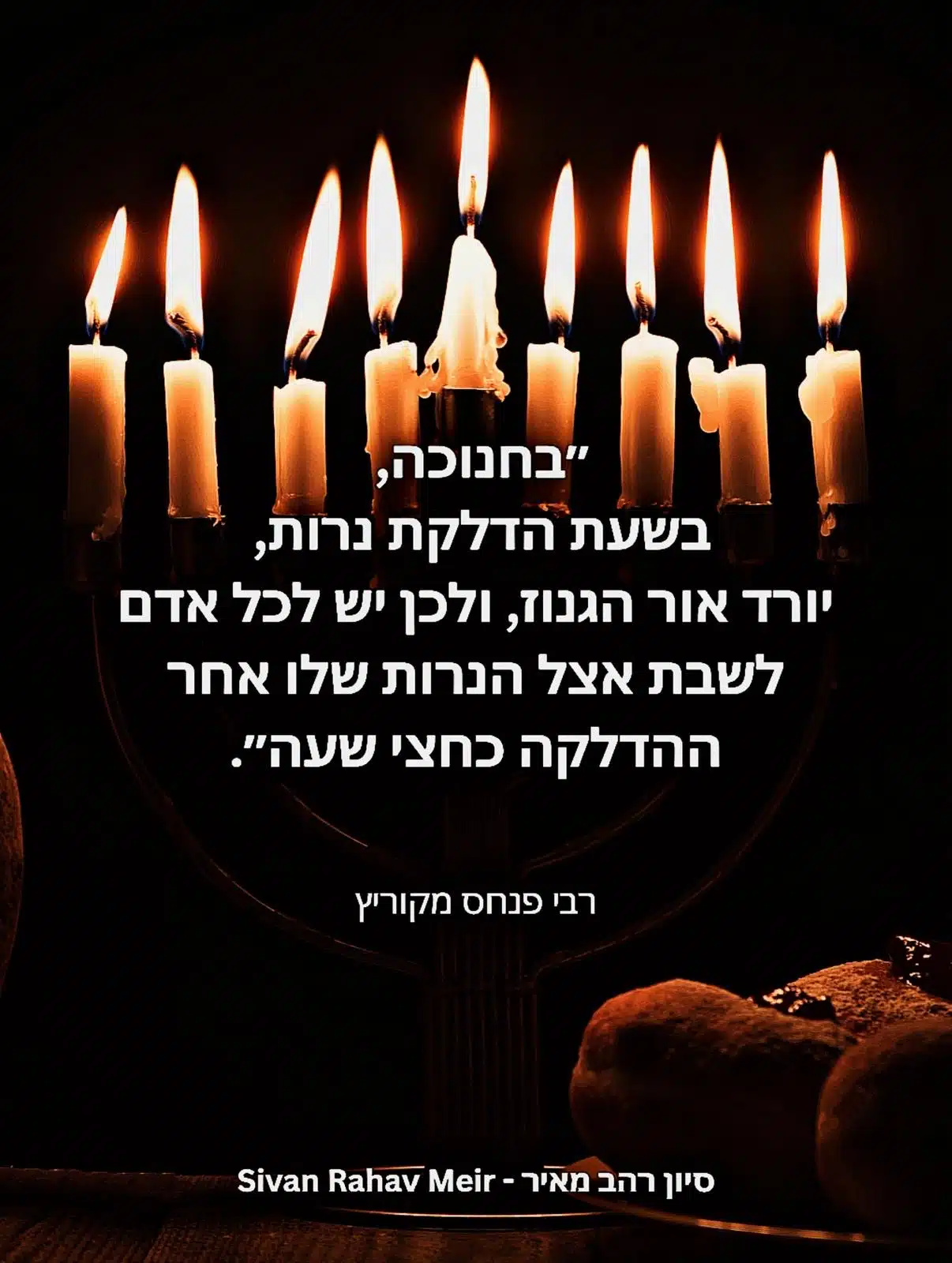 Rabbi Pinchas of Koritz, among the earliest luminaries of the Hasidic movement, once said: “On Chanukah, at the time of the lighting of the candles, a hidden light descends and every person is obligated to sit by their candles, once they are lit, for a full half hour.”