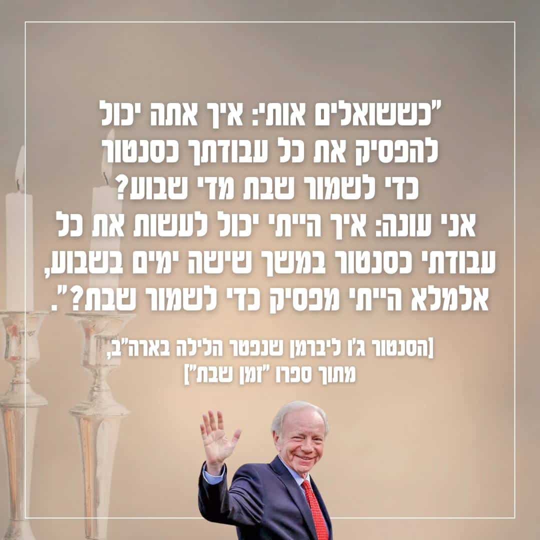 Lieberman said that he had written a book about Shabbat because he wanted to communicate to young Jews around the world that they don’t have to give up their heritage in order to achieve the highest levels of professional success. In fact, he claimed, the opposite was true. His Sabbath observance, especially in the middle of an election campaign, only strengthened people’s admiration for him as a man of principles and integrity.