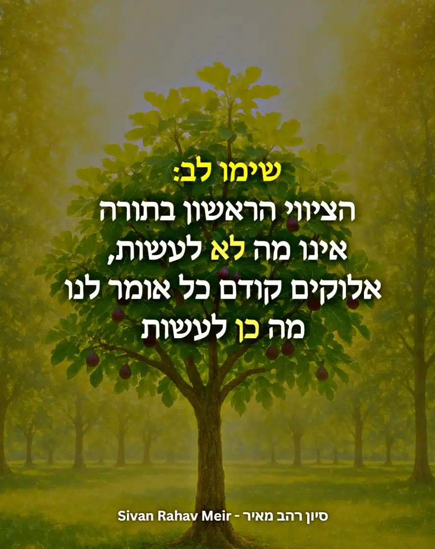 Test yourself for a moment: What is the first commandment that God gave Adam in the Garden of Eden? Most people will answer: “Not to eat from the Tree of Knowledge.” In other words, first God told us what not to do, what was forbidden.